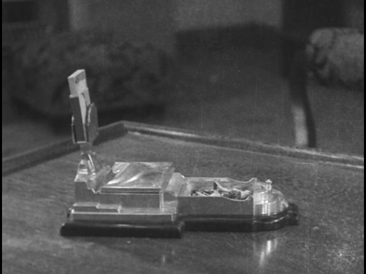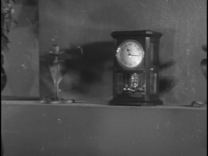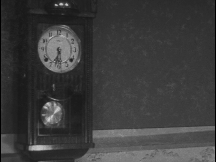 From the small house to the actress’ house. Throughout the second half of the film, as the family unit is increasingly split up geographically, Naruse will use match cuts to link the various characters and elide time (notice the 20 minutes difference in a single cut). Here’s another one that starts with the step-mother, now working in a department store looks up at the clock, leading to a shot of the clock at her home, but this time with a pillow shot inserted between the match: