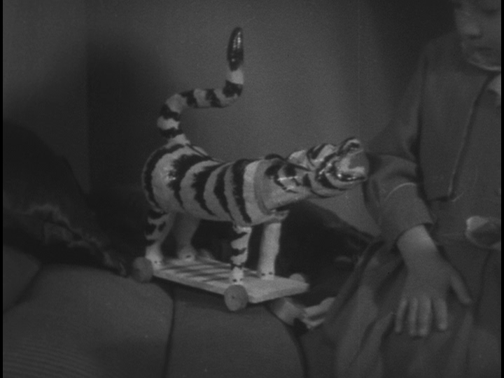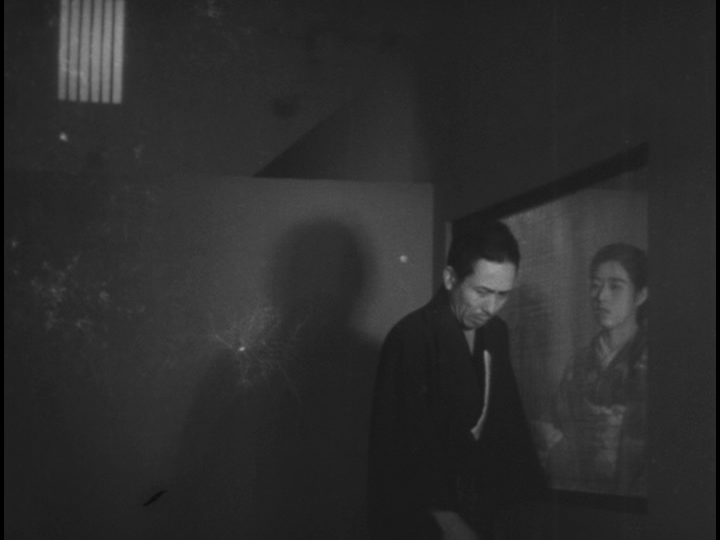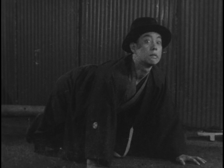A neat match-cut occurs a bit later, as Masako’s friend Kusakabe (played by Joji Oka, who looks familiar but I can’t place him, he was in Ozu’s Dragnet Girl but I haven’t seen that) finds the actresses brother and his thief friend and accosts them outside a bar. Kusakabe is a big man who carries a stick and has a pretty beard, so he throws the thief down easily, leading to this cut from the thief to the little girl in her apartment playing with a toy tiger:
