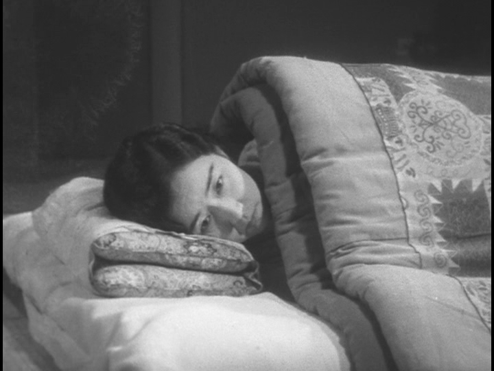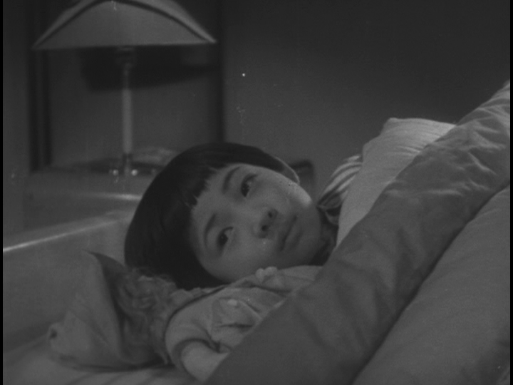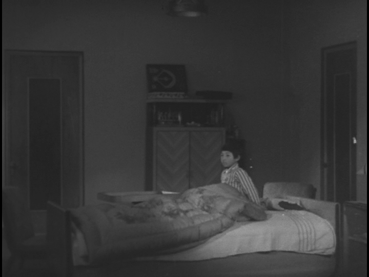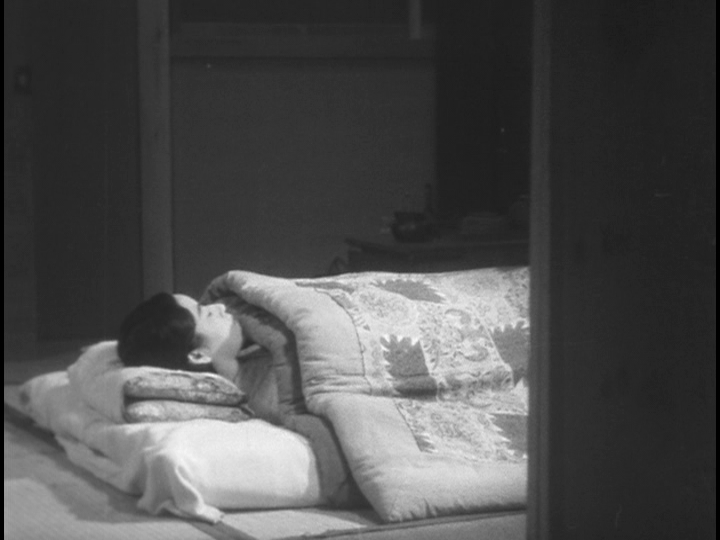 The most poignant series of edits come a few scenes earlier, as Masako and Shigeko, lying in bed in their separate homes seems to communicate across space via the medium of the match cut (with only a lamp between them):