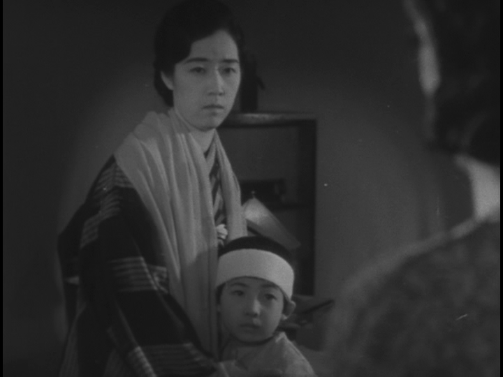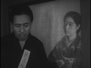 An hour and a half has elapsed, which might account for the pillow shot (it gives a greater sense of time passing), but there’s more. When Masako arrives home, she finds her mother-in-law, unable to deal with their financial insecurity, has taken Shigeko to live with the actress. The empty shot (a landscape with a lake, a blankness, in the center) in-between the match-cuts presages the emptiness in Masako’s home.