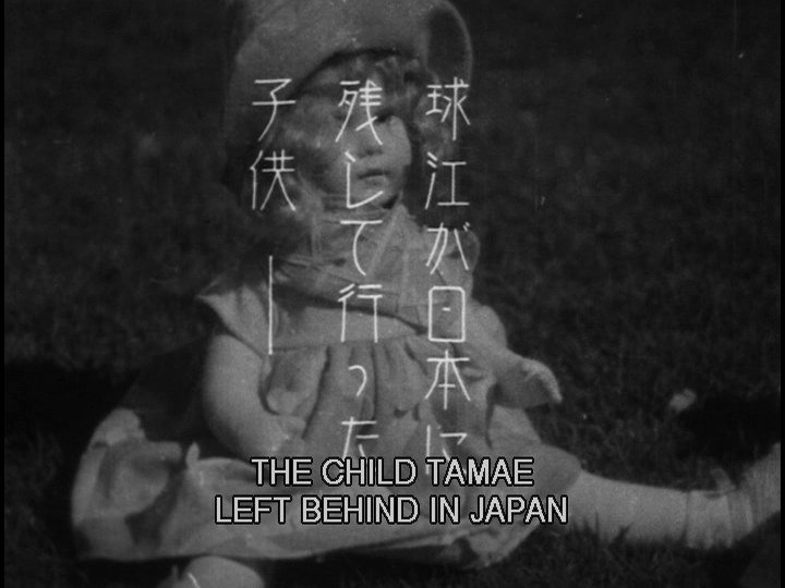 The daughter, Shigeko, is introduced in cutting from the actress’ arrival in Japan to this shot of a doll, complete with super-imposed titles, followed by a pan along the ground to the girl herself: