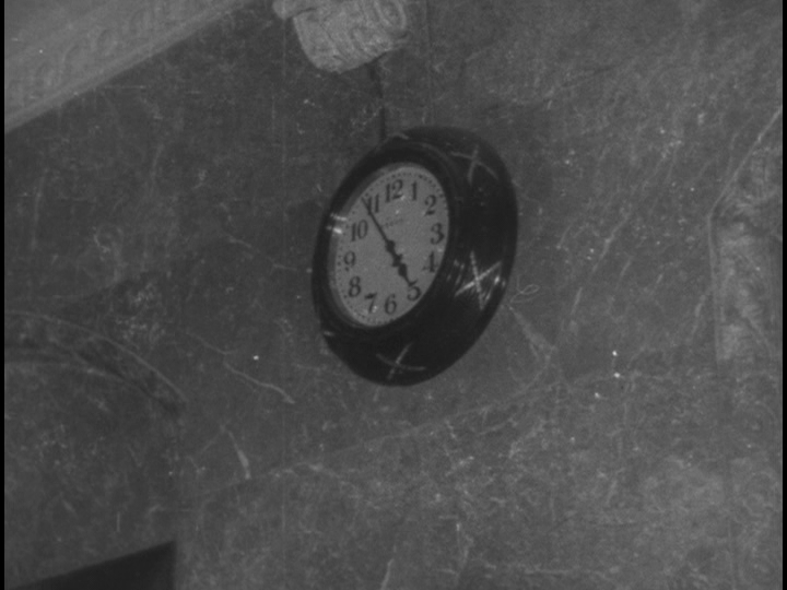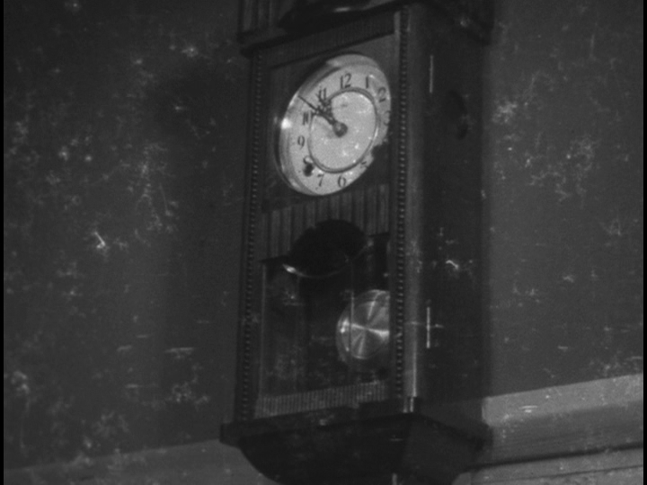 But I’ve gotten ahead of the plot. After the bankruptcy announcement, before the arrest, Shigeko is out playing with her doll and almost gets hit by a car but the step-mother saves her, getting hit herself (sacrificing herself for the child). There’s a short scene at Atsumi’s office when he explains to his employees that he can’t afford to pay them marked by long lateral tracks through the windows of the office building and along the rows of the assembled employees. Naruse’s tracks are faster and the camera is closer to the action, but the graphical effect is similar to Jean-Luc Godard’s memorable tracks in Tout va bien. When he returns to the house, all their furniture is being repossessed, his mother harangues him because she’ll now have to live in a smaller house and he gets taken away by the police. Then we cut to some time later, with the daughter and step-mother in the smaller house when Naruse makes the first of two match cuts on clocks: