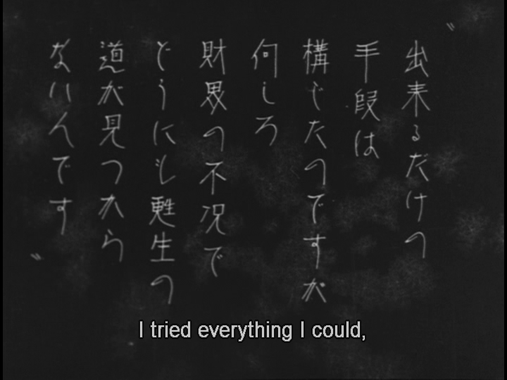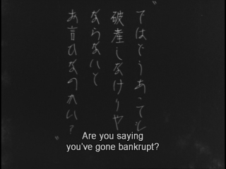 A kind of associational montage I don’t think I’ve ever seen before in a Japanese film of this period (you can see it a lot nowadays, though not often reputably: Gus van Sant’s Psycho and Django Unchained are the first that come to mind). His mother asks if he’s bankrupt, he nods, then a quick push in to a close up of her, followed by shots of wind through trees, rustling leaves and cigarette smoke: their wealth blowing away in the Depression. We’ll see the same kind of thing later in the film when Atsumi is taken away by the police (something to do with his bankruptcy, it’s not important) and then again when he’s in prison.