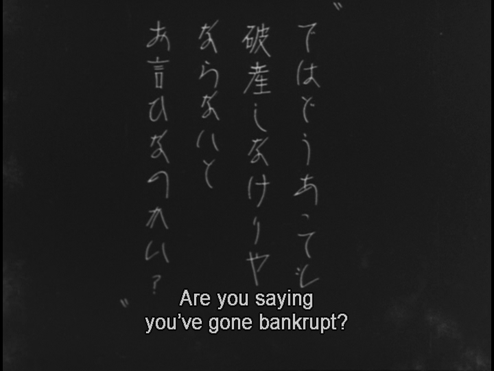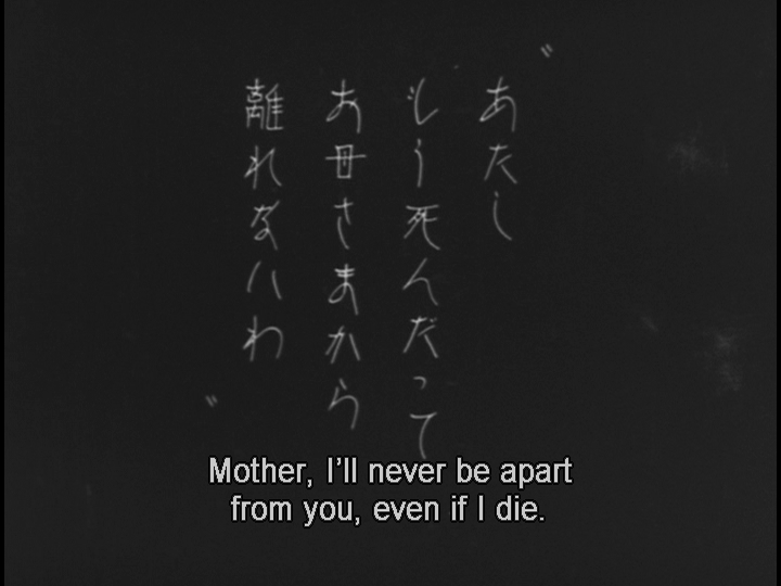 In addition to this flashy edit, Naruse also uses the push-in more extensively and more creatively than I’ve seen before. When Shigeko first meets her birth mother, she shouts at her and the words, in titles, zoom forward followed quickly by rapid push-ins on the mother, as if the girl is hurling the insults at her.
