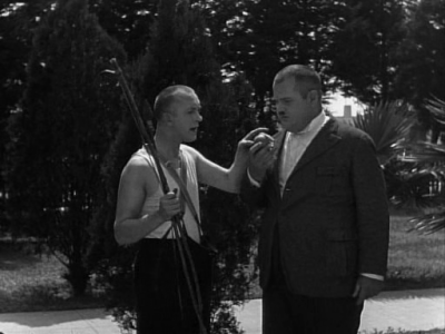 Davidson plays an exasperated father who wants to sell his house so he, his wife, and their son can escape from the lunatics who live next door. A title card asserts that these guys, played by a Roach Murderer’s Row of Stan Laurel, Oliver Hardy, Charley Chase and James Finlayson, are training to be radio broadcasters, “the quicker they go daffy, the sooner they get a diploma”. I’m unsure how literally that’s supposed to be taken, but it doesn’t matter, the point is the four of them are incredibly annoying, making terrible jokes with bottom-of-the-barrell slapstick, the kind you’d expect from any random morning DJ pair (do they still have those?). The four cuckoos aren’t supposed to be funny and at that they succeed: their performance is as much a parody of terrible slapstick comics as it is of the radio. Seltzer bottles, a William Tell bit (Hardy gets shot in the ass), ridiculous outfits (Laurel wears his suspenders criss-crossed, Chase wears an over-sized sailor suit with a monocle), terrible intertitle puns and so on.