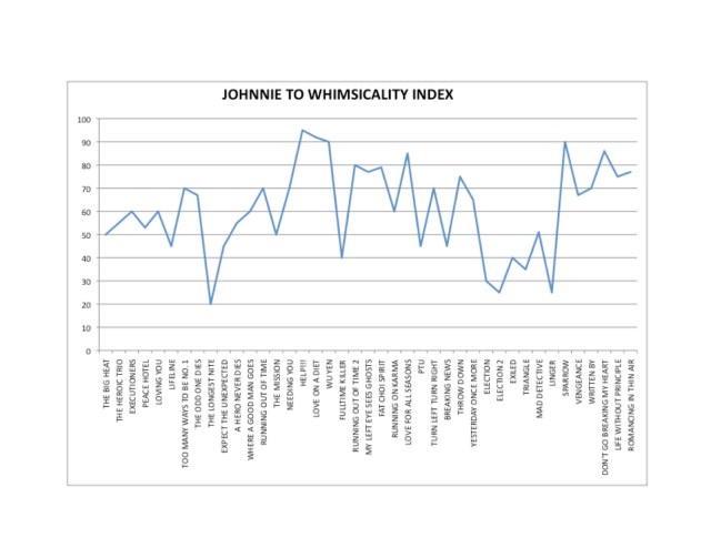 All 41 of the films by Johnnie To and/or Wai Ka-fai that I’ve seen, by Whimsicality Score over time. Whimsicality Score is how whimsical I think the film is on a scale of 0-100. The recent film with the lowest Whimsicality Score I can think of right now is Dear Zachary, which I’d give a 5, whereas Duck Amuck would approach a Whimsicality Score of 100.
