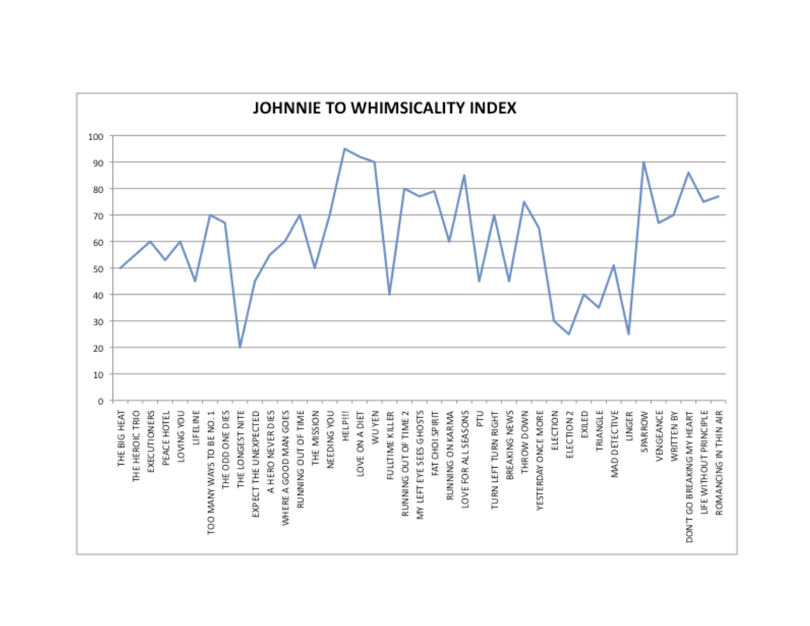All 41 of the films by Johnnie To and/or Wai Ka-fai that I’ve seen, by Whimsicality Score over time. Whimsicality Score is how whimsical I think the film is on a scale of 0-100. The recent film with the lowest Whimsicality Score I can think of right now is Dear Zachary, which I’d give a 5, whereas Duck Amuck would approach a Whimsicality Score of 100.