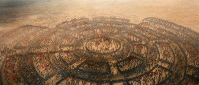 The Battle of Red Cliff took place in the early 200s, roughly contemporaneous with the events in Ridley Scott’s Gladiator and that film, along with Peter Jackson’s Lord of the Rings provides a clear inspiration for the CGI-enabled epic scale of Woo’s production. Long pull-out shots reveal hundreds of artificial ships as Cao Cao’s navy makes its way down the Yangtze; phony (or certainly at least digitally retouched) landscapes emphasize the beauty of the South and the need to preserve it from Northern aggression. Judicious use of digitally slowed and sped up motion (as in Tsui Hark’s 2005 Seven Swords) liven up the action’s long unbroken takes. Here the comparison with Gladiator is important, as Scott smears his action into blurry, swish pan and quick cut nothingness while Woo keeps everything crisp and organized, with overhead shots orienting us spatially while simultaneously making apparent the tactical ideas behind the coordinated troop movements painstakingly designed by Zhuge and Zhou.